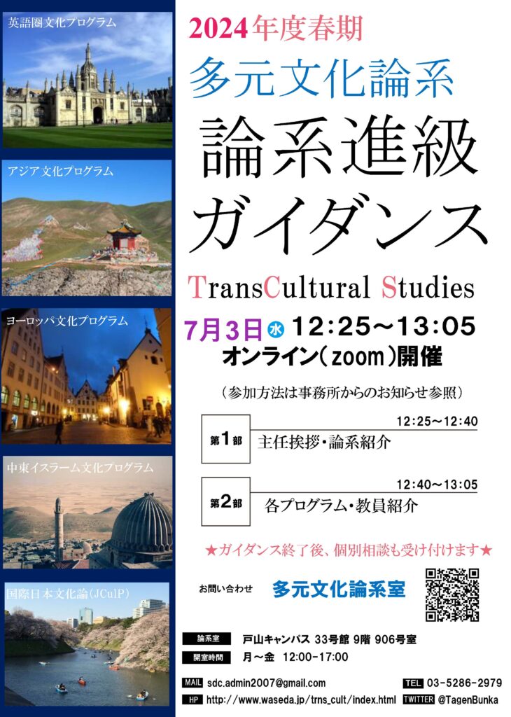 1年生向け論系進級ガイダンスを開催します 2024年6月24日 最終更新日時 : 2025年10月1日 多元スタッフ 多元文化論系では、春期論系進級ガイダンスを行います。開催要領は以下の通りです。 日時:2024年7月3日(水)12:25~13:05 場所:オンライン(Zoom)