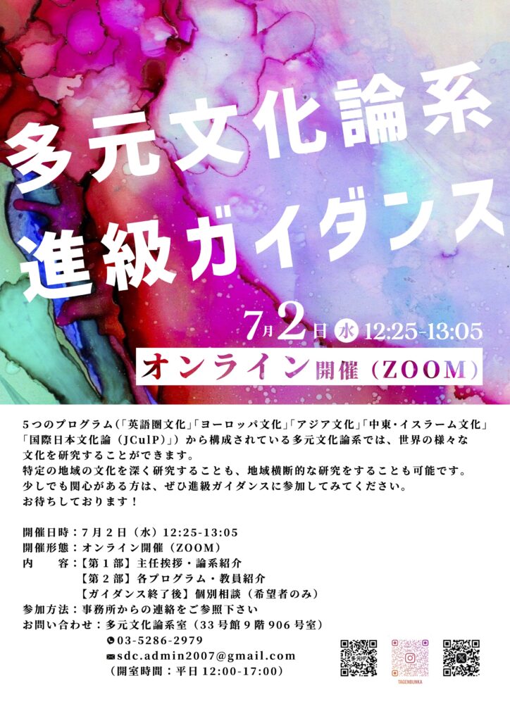 多元文化論系では、春期論系進級ガイダンスを行います。開催要領は以下の通りです。